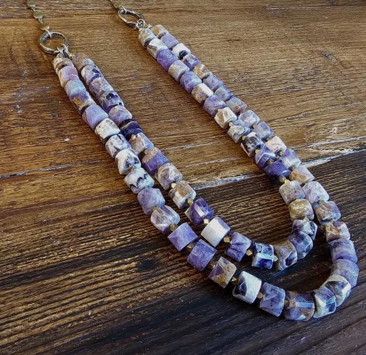This double-strand dogtooth amethyst necklace is a bold yet elegant statement piece, perfect for lovers of handmade gemstone jewelry. The rich purple amethyst heishi beads (6x5mm) display natural chevron patterns, creating a striking contrast with faceted African brass spacers that catch the light beautifully.