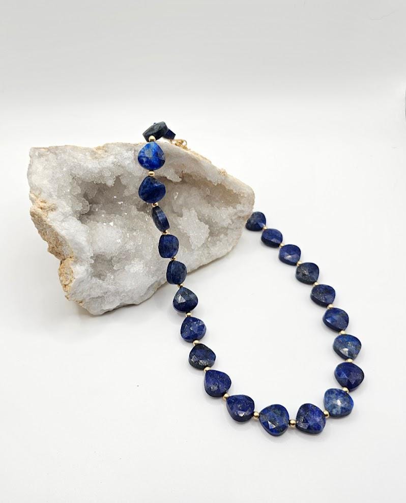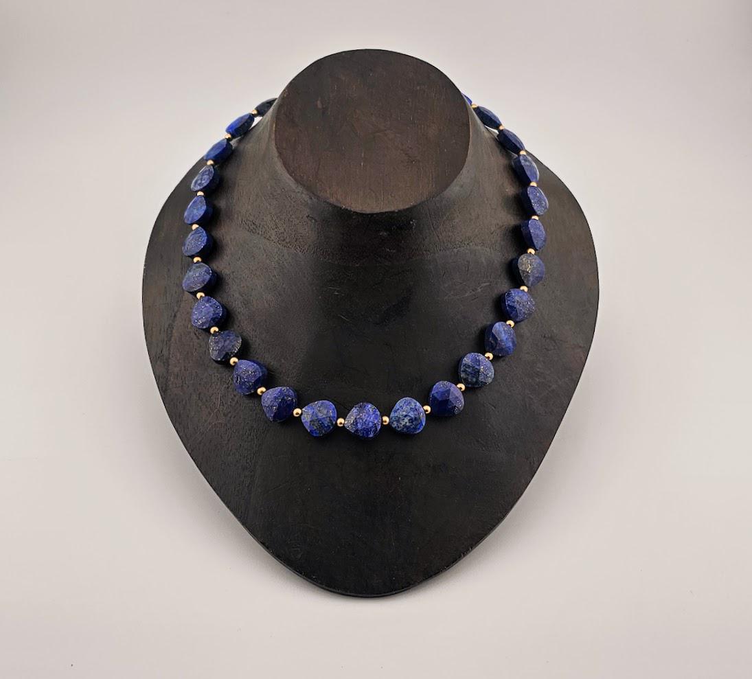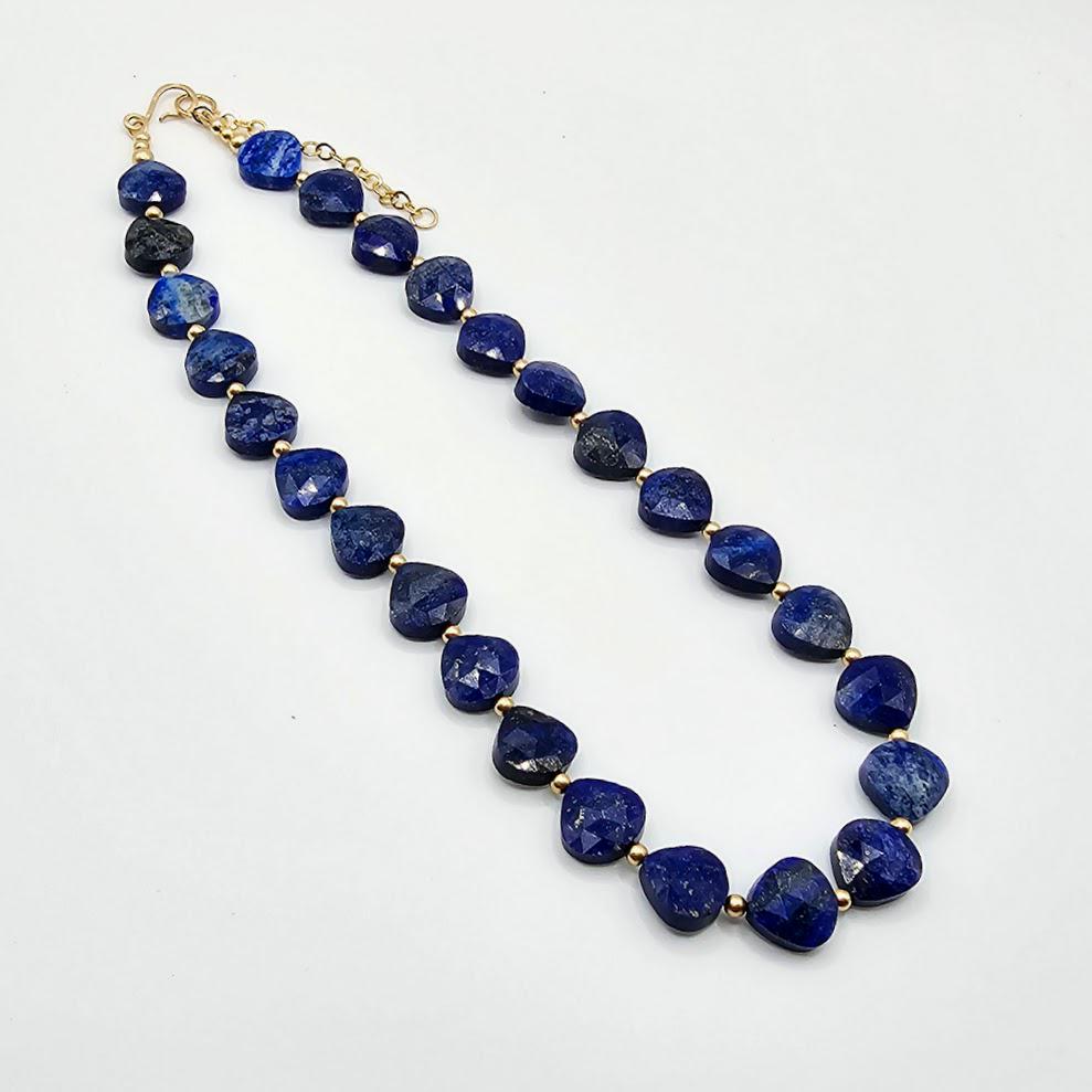 To show the unique details, color variations, and faceting, the necklace is photographed up close. Because of lighting, screen settings, and the natural variation of lapis, colors may appear slightly different in person.