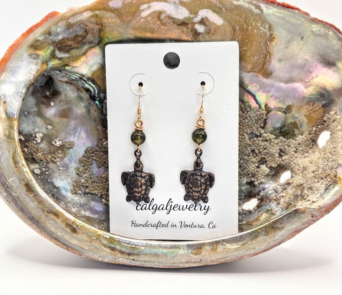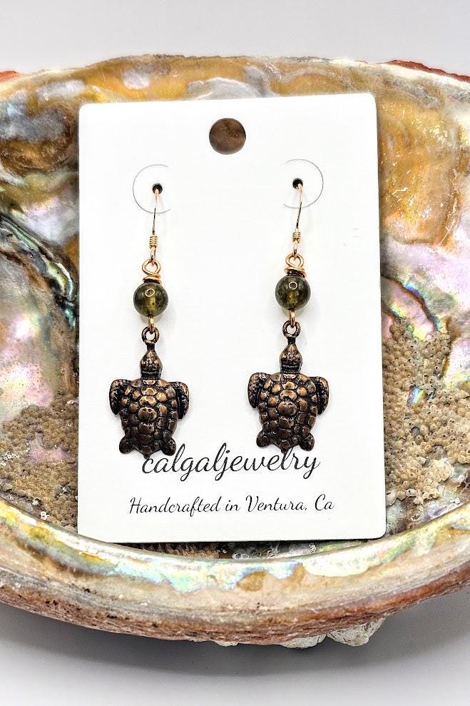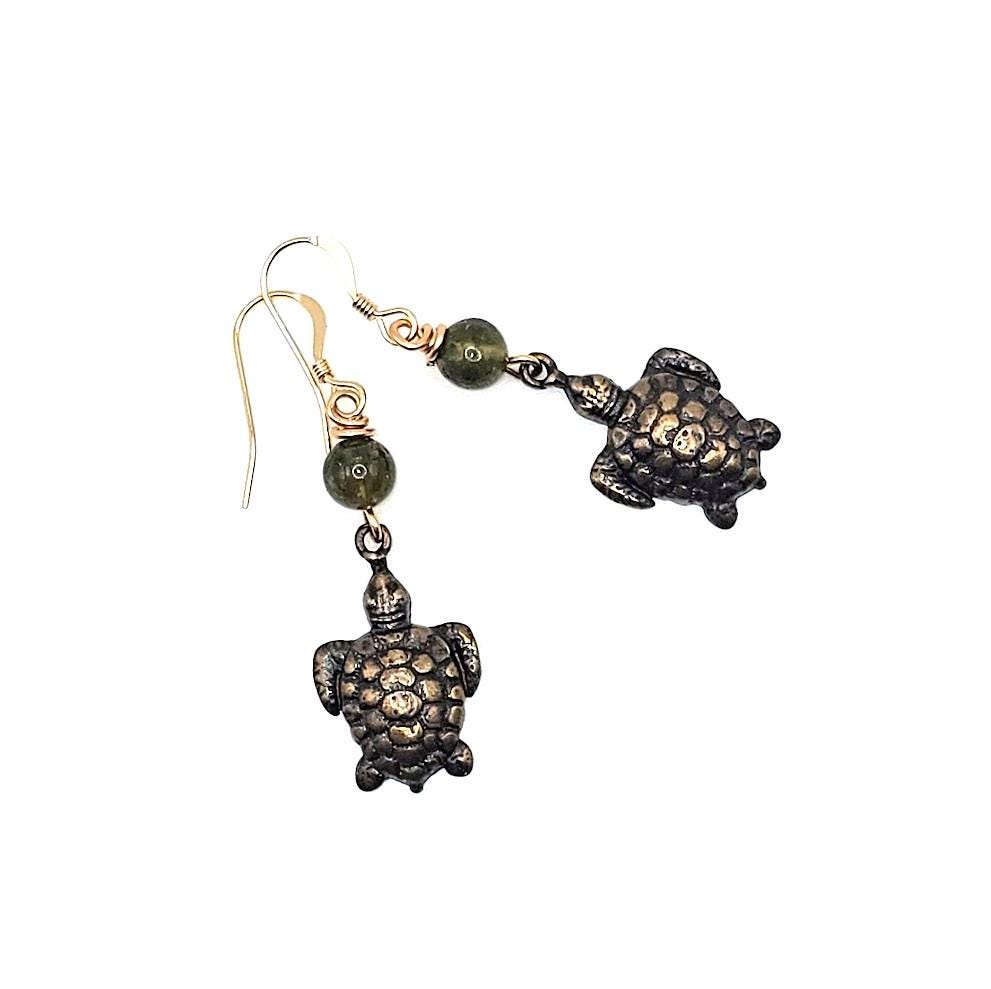 These earrings bring together rich, natural color and timeless design. Solid bronze turtle charms hang beneath 5mm deep green garnet beads, where the warmth of bronze meets the fresh, earthy green tones for a beautifully balanced, earthy-meets-ocean feel.