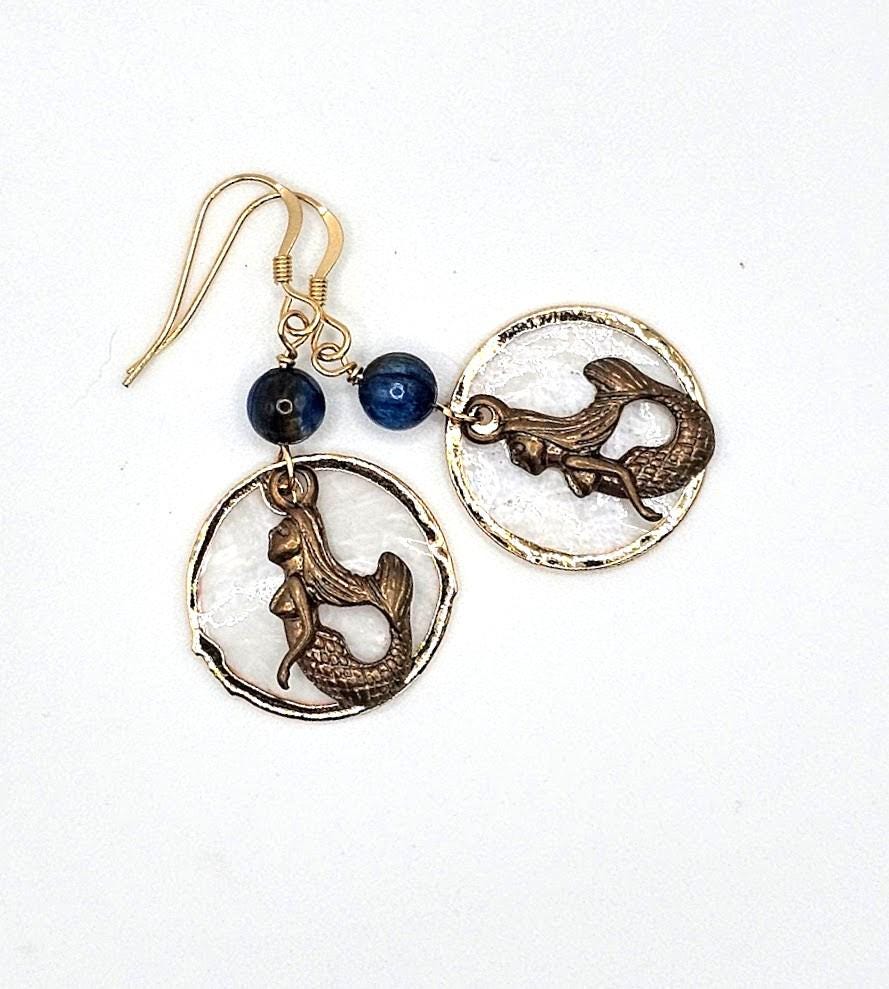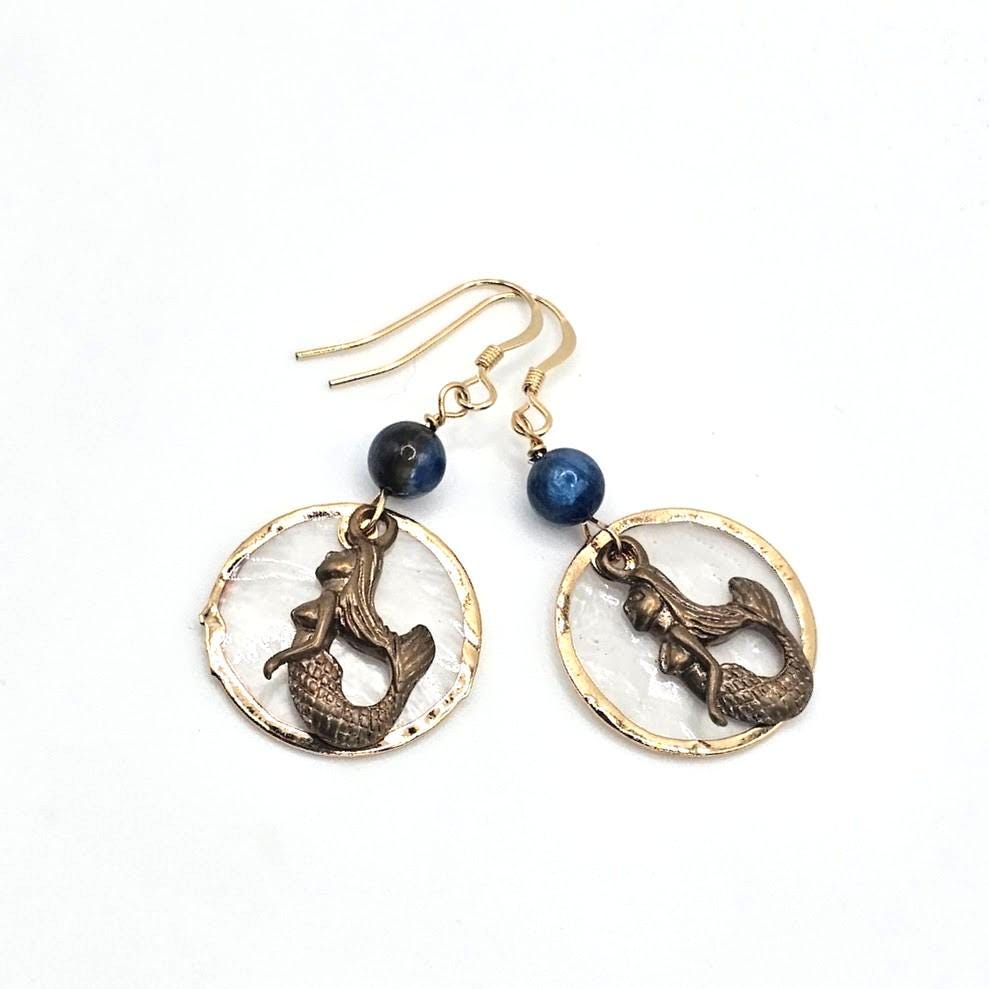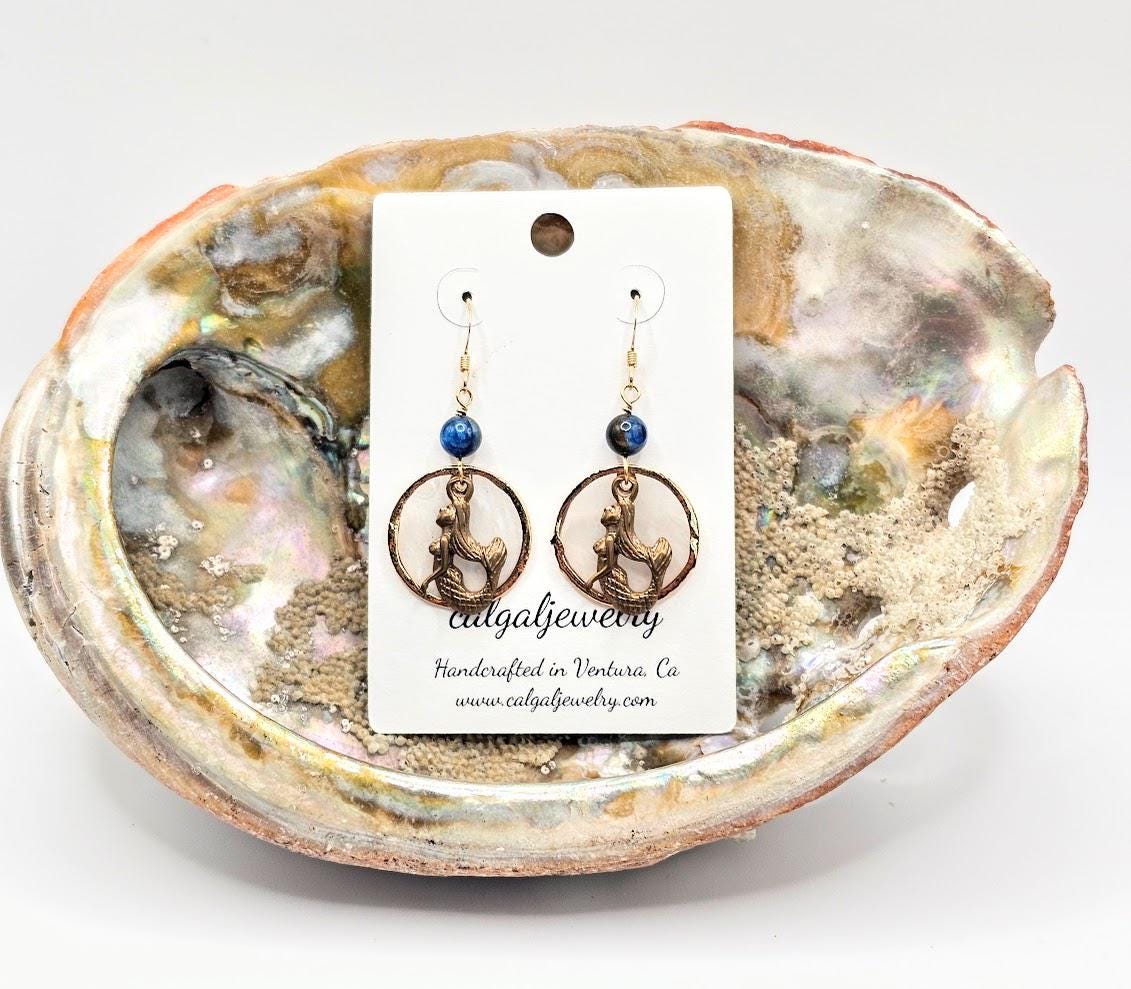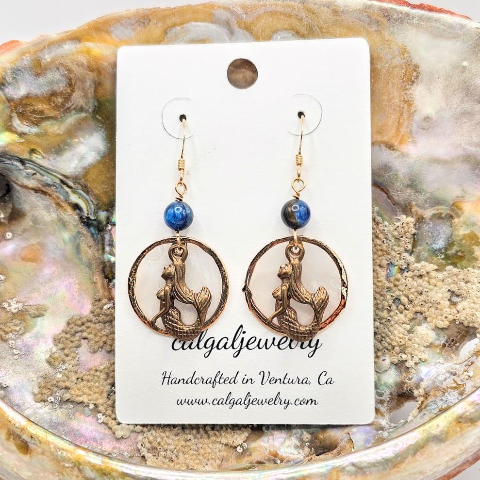 These bronze mermaid earrings bring together ocean texture and rich color in a design that feels both beachy and refined. A solid bronze mermaid is set against a luminous Capriz shell focal with a gold finish, creating depth and subtle shimmer with every movement.