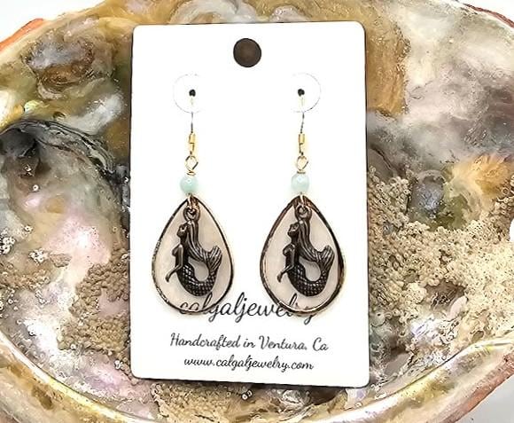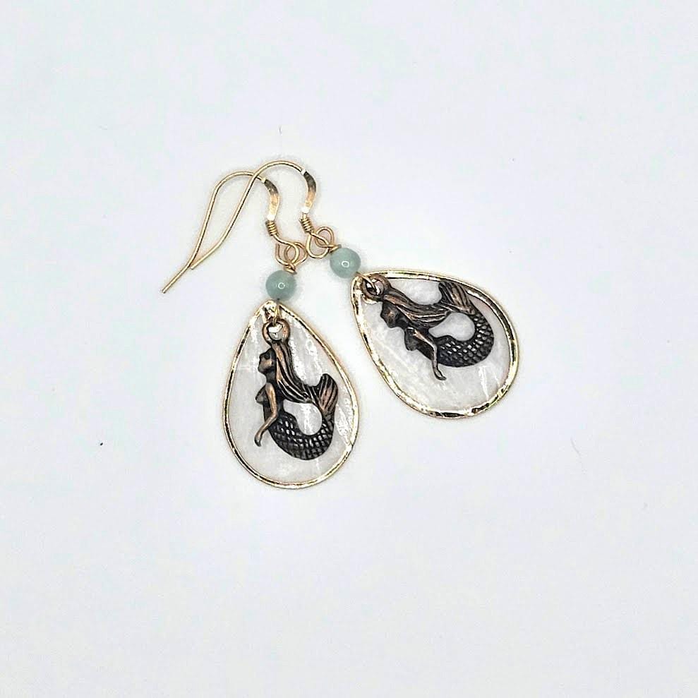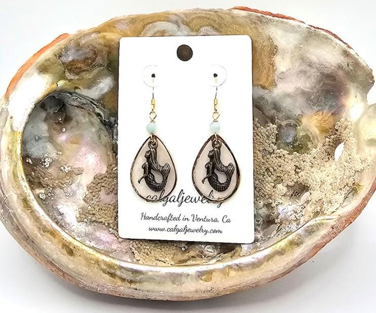 These bronze mermaid earrings bring together ocean texture and soft color in a design that feels both beachy and refined. A solid bronze mermaid is set against a teardrop Capriz shell focal with a gold finish, creating graceful movement and subtle shimmer.